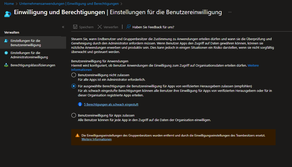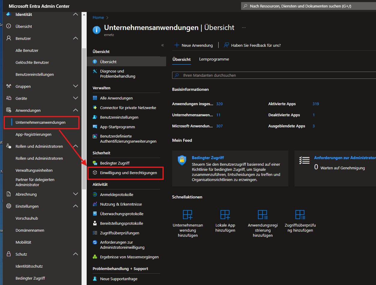 Als erstes muss im Entra Portal unter den Unternehmensanwendungen, die "Einwilligung und Berechtigungen" abgeändert werden.