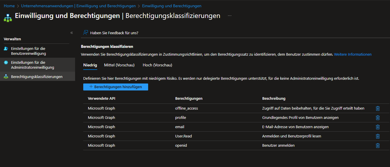 Im Unterpunkt für die Berechtigungsklassifizierung kann man niedrig eingestufte Berechtigungen für den Benutzer freigeben. Beim ersten mal sollten Vorschläge dafür vorhanden sein. Ansonsten hier eine Übersicht.